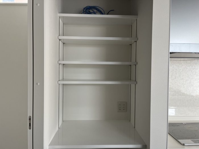 【キッチン横の可動棚】 パントリー&家電置き。 使い勝手がいい可動棚です。 |