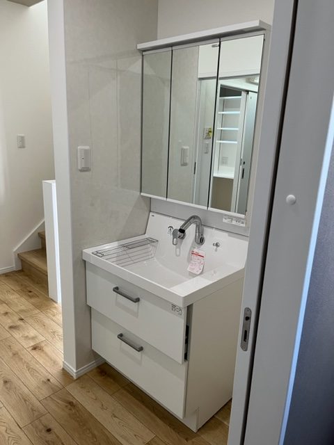 【洗面化粧台】 かがまなくても中のものを取り出しやすいスライド扉と 収納付き三面鏡。 |