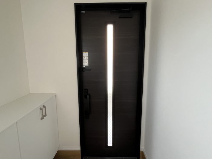 【玄関中から見た玄関ドア】 縦型の採光部から優しい光が入ってきます。 |